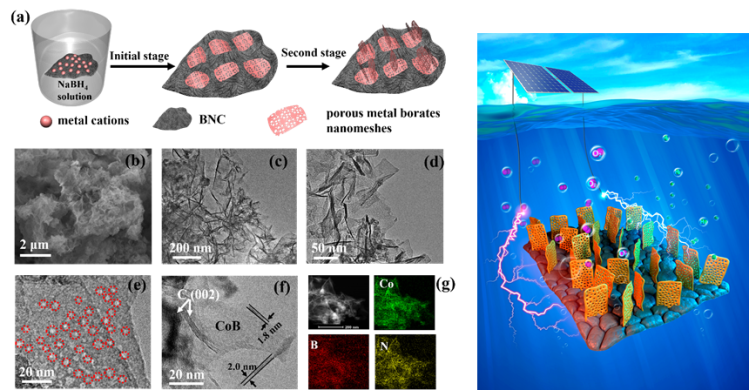 在过去的十年,构建二维过渡金属纳米片已经成为制备高效电催化材料的有效手段。尤其是仅有原子厚度的超薄纳米片具备较大的比表面积、较高的表面/体积比,使得表面原子达到最大的暴露。因此,超薄的纳米片在氧析出反应中普遍具有优异的电催化活性。但是,超薄纳米片的横向质量扩散能力较差,使得其活性难以进一步提高。与之形成鲜明对比的是,超薄的纳米网状材料不仅完美地继承了超薄纳米片的优势,而且具备规则的多孔结构,可以极大地促进电催化过程中的传质,从而提高纳米片状材料的电催化活性。但是,大多数的过渡金属纳米网都是使用硬模板的方法合成,具有合成过程繁琐的缺点。因此,开发简单、有效的方法来合成超薄的过渡金属纳米网并进一步研究其在电催化反应中的独特优势,是十分有意义的。最近,乐竞平台化学与环境工程学院何传新教授课题组介绍了一种利用三维树皮状氮掺杂碳为纳米反应器来合成超薄金属硼酸盐纳米网的通用方法,并将所制备的金属纳米网用于完全电解水,研究了超薄纳米片组成的网络结构在电催化反应中的独特优势。