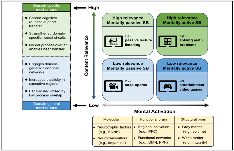 论文进一步提出了“心理激活×内容相关性”双维框架,以解释不同久坐形式为何对大脑健康产生截然不同的影响。作者指出,久坐行为的差异不仅体现在认知参与的强度上,也体现在所激活神经系统的方向性上。其中,心理激活(mental activation)反映个体在久坐过程中投入的认知资源和注意水平;内容相关性(content relevance)描述该活动所涉及的认知过程与目标功能系统之间的匹配程度。二者共同决定了久坐行为的“认知质量”,也决定其对神经功能产生促进或抑制的方向。